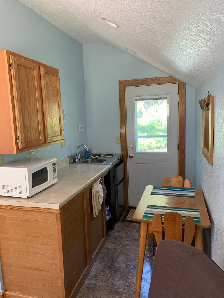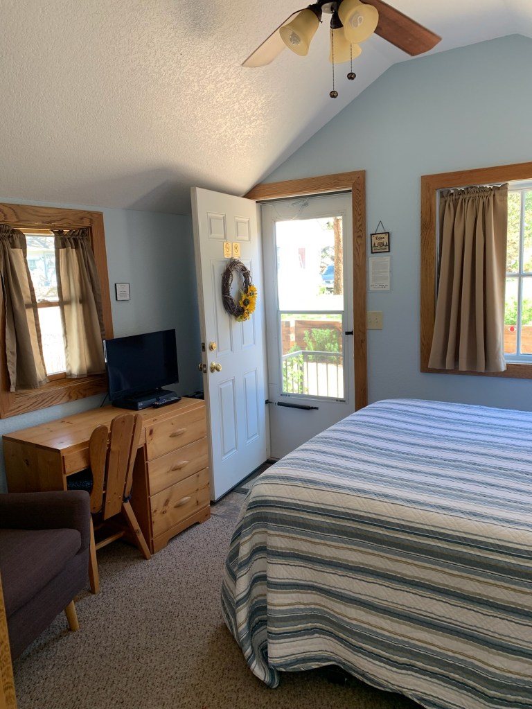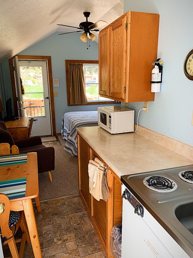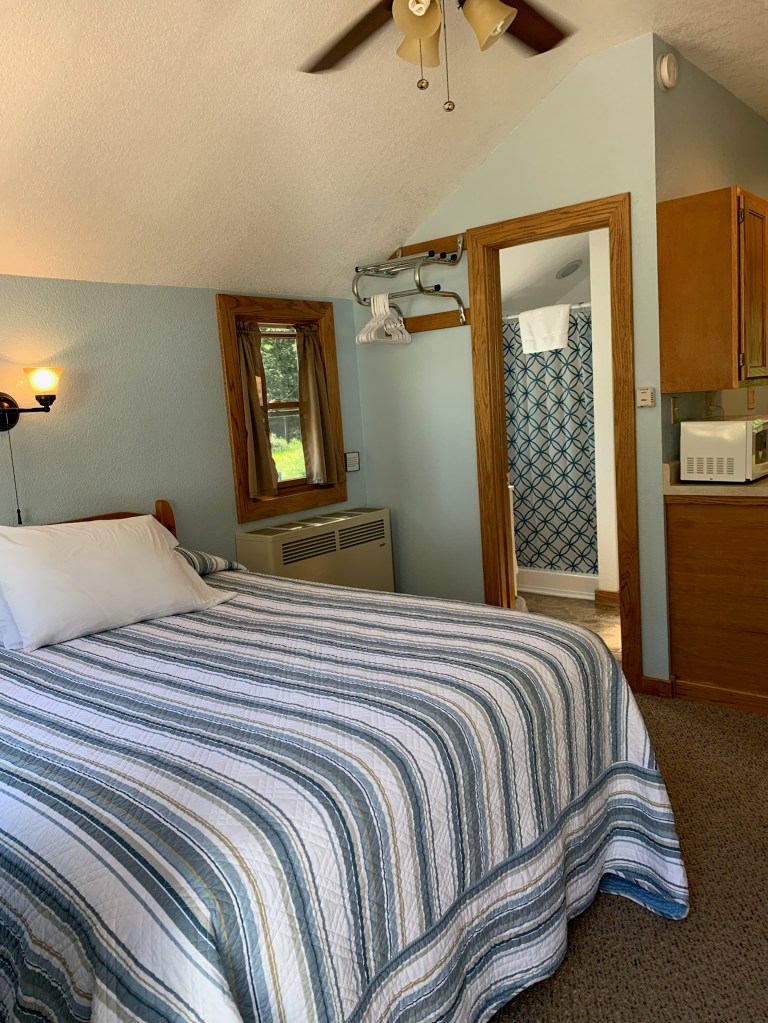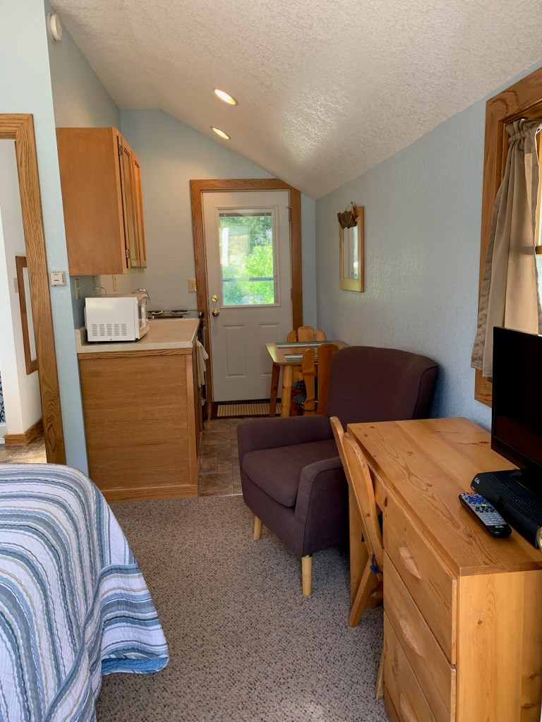 One bedroom studio, one queen size bed, kitchenette, bathroom with shower, river front patio and chairs by the water’s edge, private campfire pit, two people maximum. Rates include daily access to property amenities including firepits, grills, horseshoe-pit, playground and hot-tub.