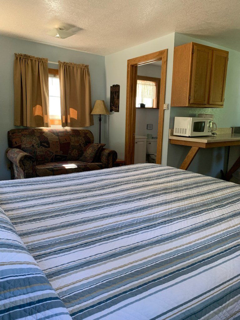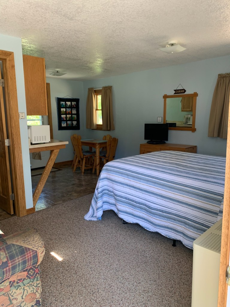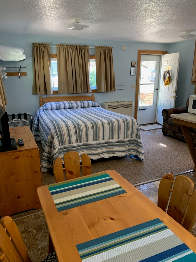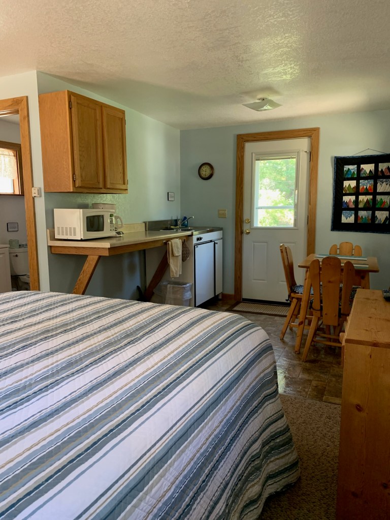 One bedroom studio, one queen size bed and one twin size sleeper sofa, sleeper is for a small child under 60 pounds, kitchenette, full bathroom, deck, river front chairs, private campfire pit by the water’s edge, two adults and one small child maximum. *$195/Night with 2 Adults/Child