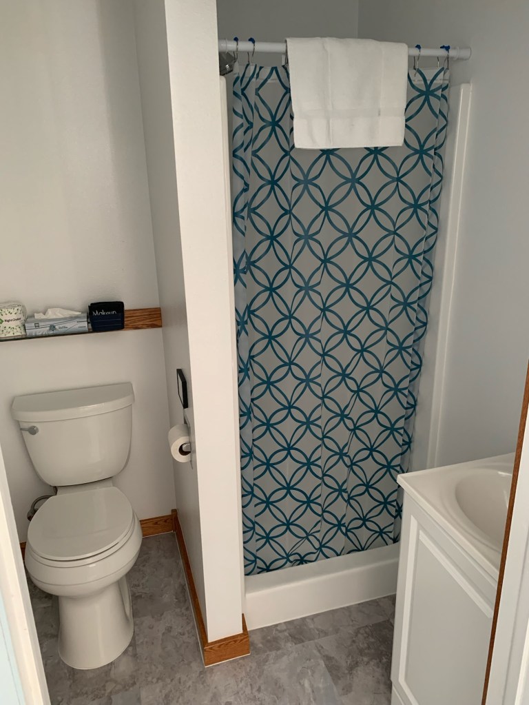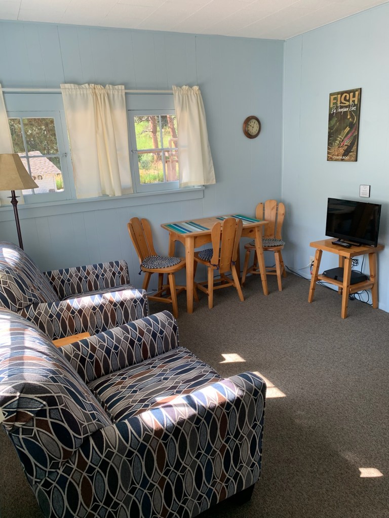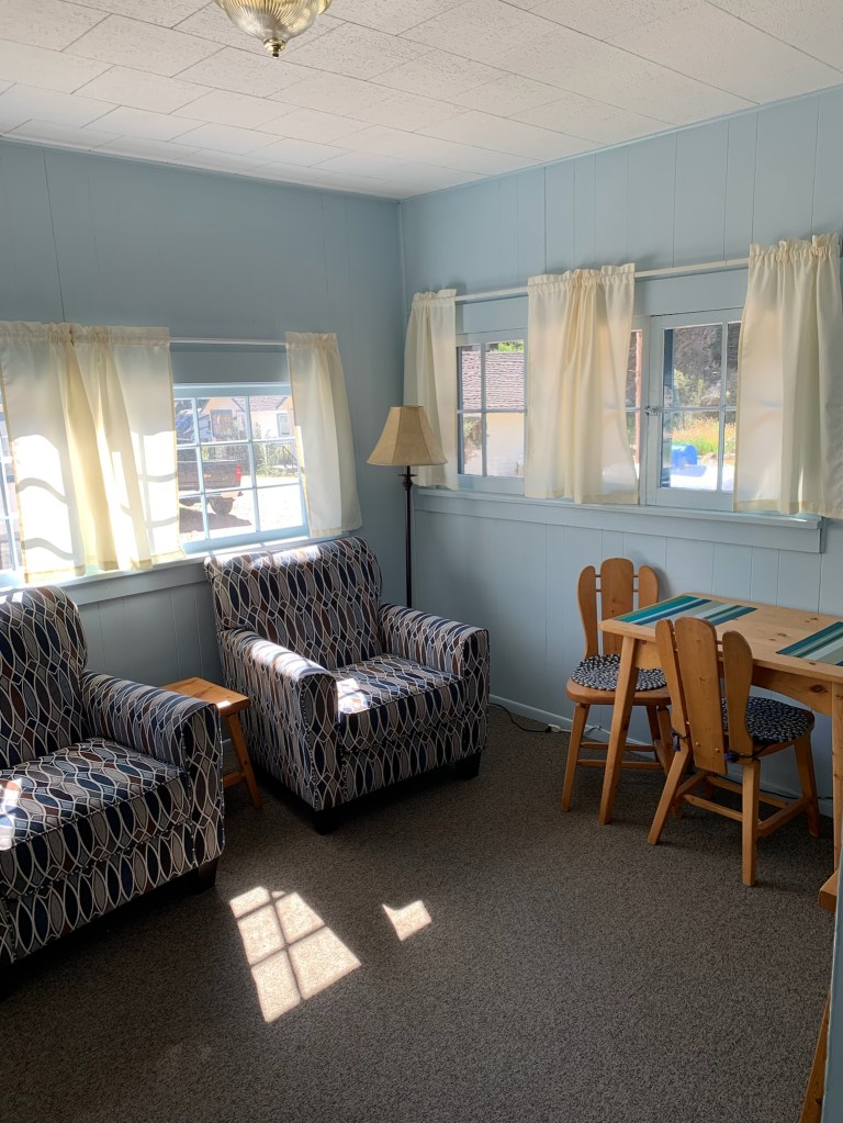 Duplex cottage, each side has two bedrooms and one bath – one double bed and two twin beds in each cottage, bathrooms with showers, kitchenettes, about 100 feet from the river, chairs and campfire pits available for your use along the river’s edge, four people maximum per cottage.